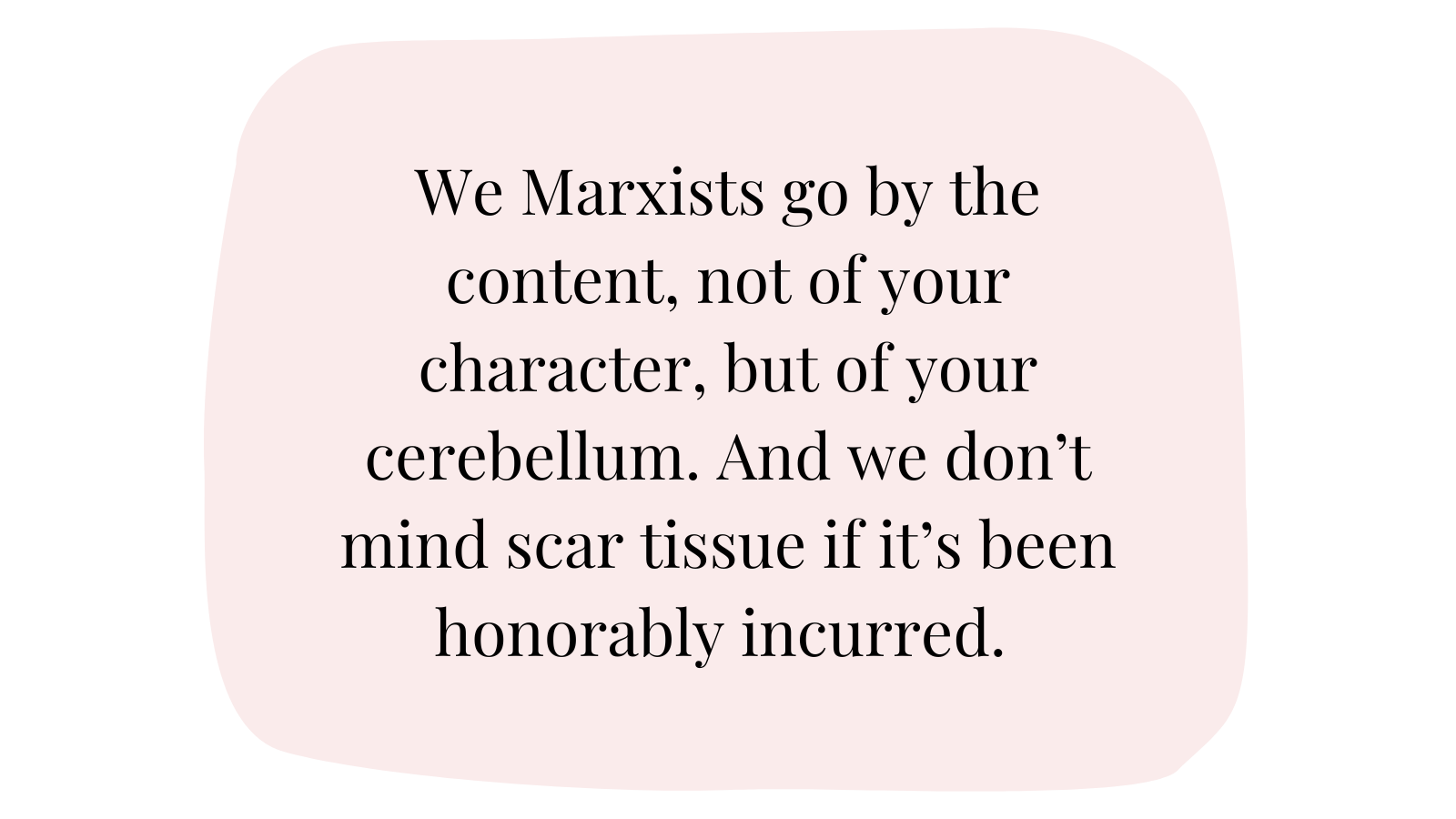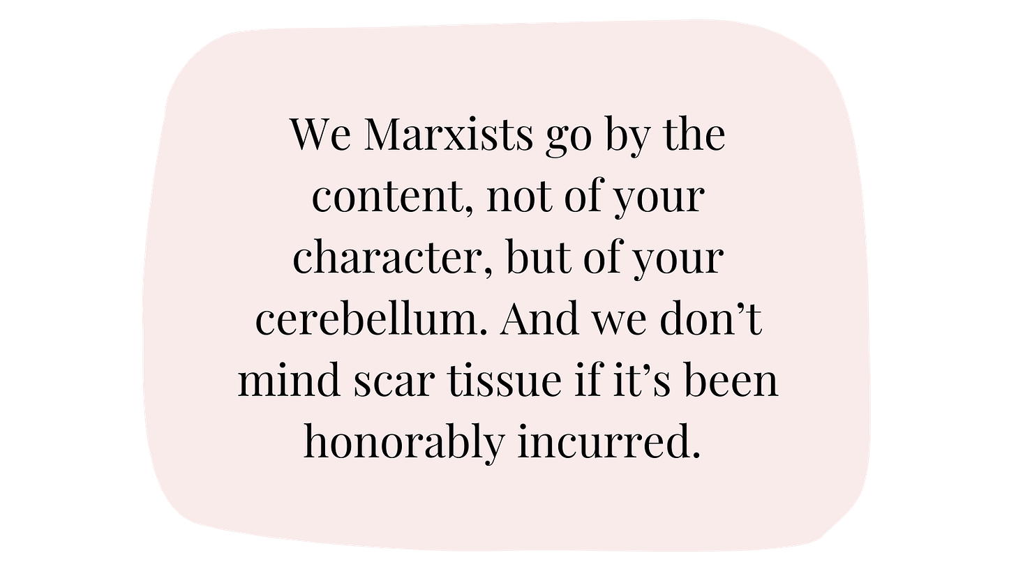The cross-dressing appeal of conservative women for radical men is buried in there somewhere. Thanks to certain ephemeral “movement” ethics, a number of our guys had every chance to get a touch bored with people – of any sex and of none – who started with their identity and continued with their feelings. Don’t tell me who you are – I can see that. And don’t tell me how you feel – tell me how you think. We Marxists go by the content, not of your character, but of your cerebellum. And we don’t mind scar tissue if it’s been honorably incurred.